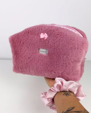 Zestawy kosmetyczka i scrunchie: Połączenie funkcjonalnej, wodoodpornej kosmetyczki z delikatną dla włosów gumką typu scrunchie, wykonaną z tej samej tkaniny.
