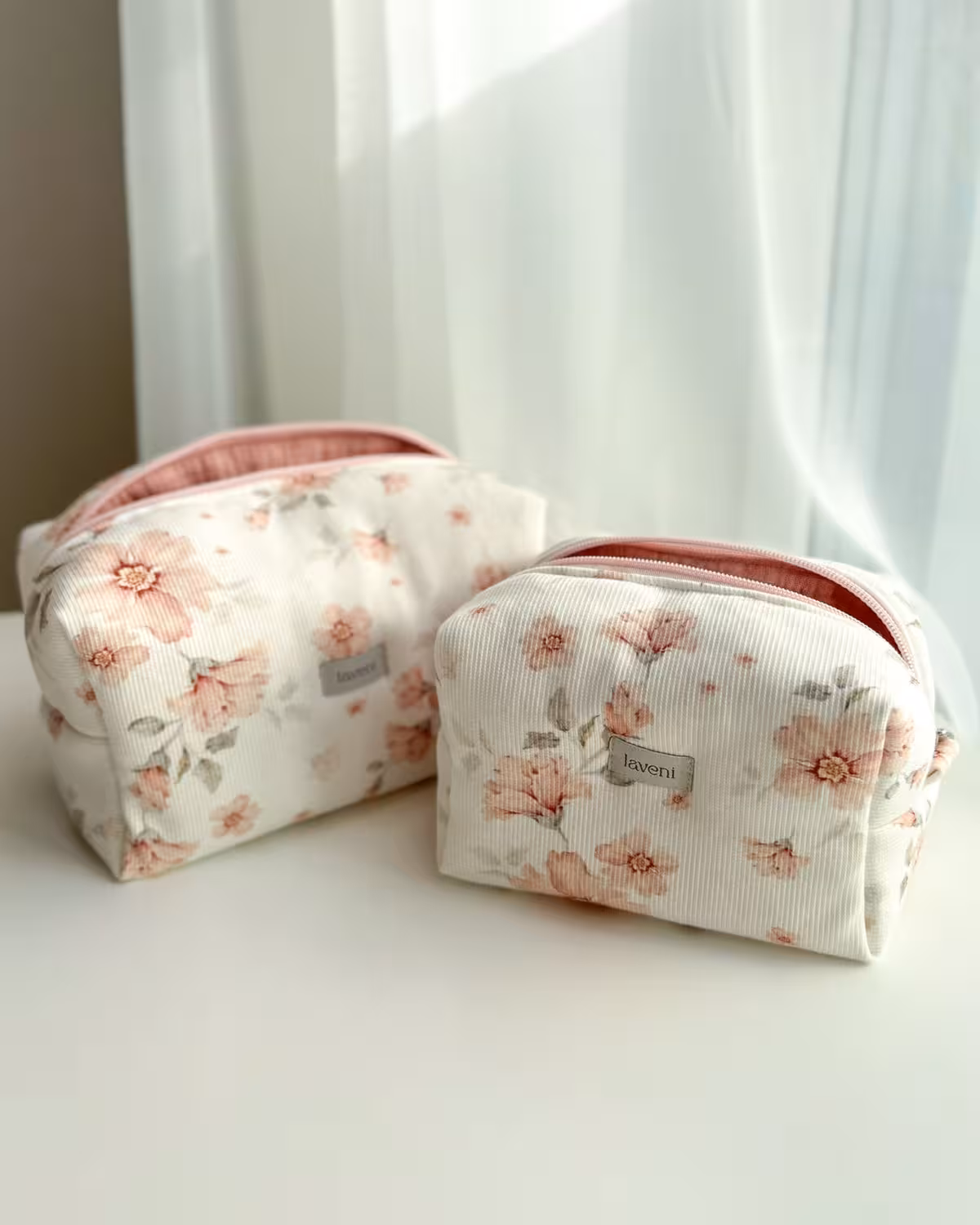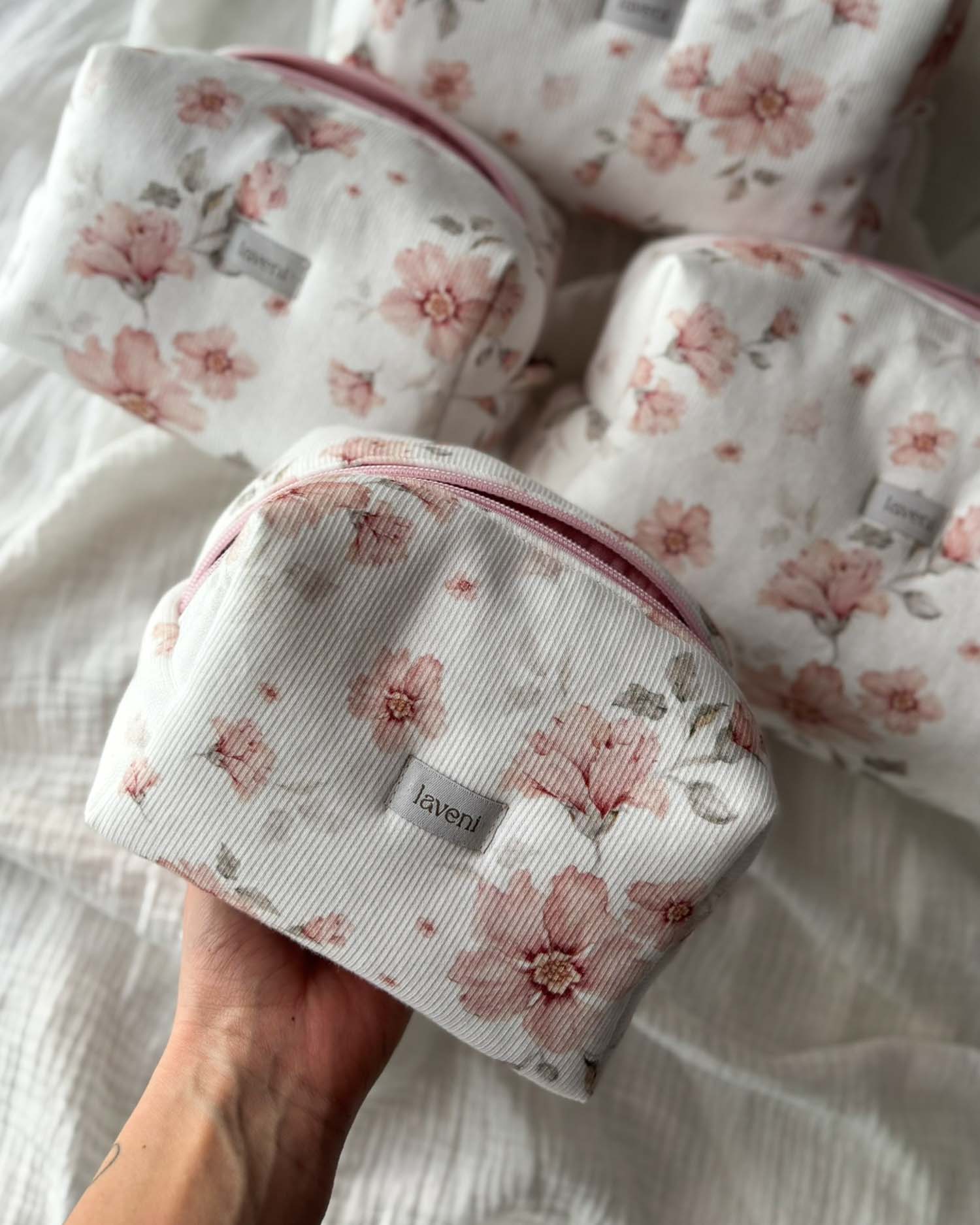Koniec z rozsypanym pudrem i brakiem miejsca na ulubione kosmetyki! Ręcznie szyta kosmetyczka na makijaż Blush Peony w urocze, delikatne peonie to absolutny niezbędnik, który łączy perfekcyjną organizację z romantycznym, kobiecym designem.