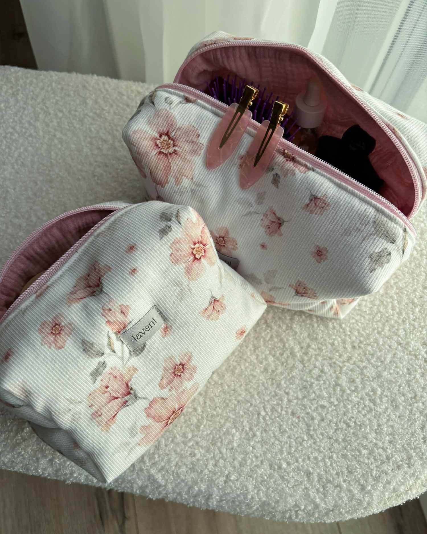 Po co wybierać, skoro możesz mieć duet idealny? Ręcznie szyty zestaw kosmetyczek Blush Peony to kompleksowe rozwiązanie, które wprowadzi idealny porządek do Twojej torebki i walizki! Uszyte z wyjątkowego, usztywnianego ażurku bawełnianego (Pointelle) w romantyczne kwiatuszki, pięknie trzymają fason i chronią Twoje kosmetyki. Wnętrze to 100% bawełniany muślin. Kupując w zestawie, zyskujesz spójny, elegancki komplet!