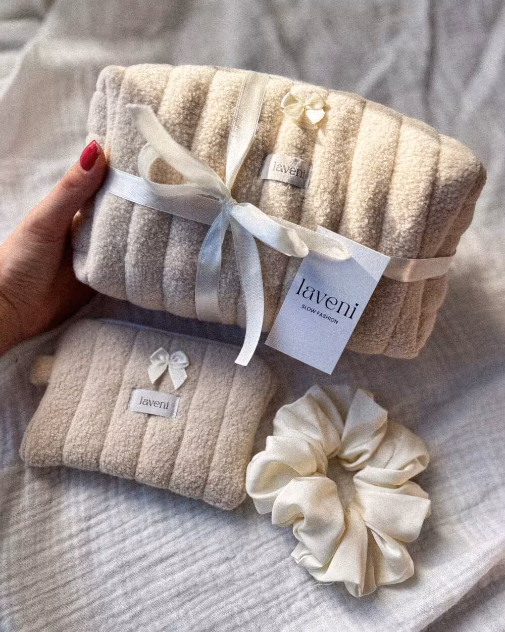 Niezwykle miękki, 3-częściowy zestaw kosmetyczka pikowana w odcieniu Soft Beige. Wykonany z naturalnego polaru bawełnianego, który w dotyku przypomina chmurkę. Wnętrze wykończone luksusowym, delikatnym muślinem. W komplecie znajdziesz kosmetyczkę, pasujący portfelik oraz jasną scrunchie Ivory. To definicja komfortu w wersji premium.