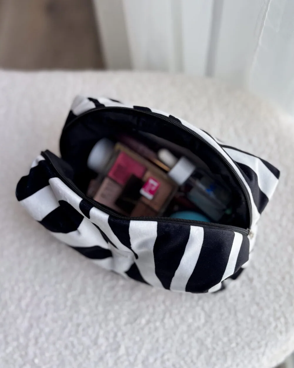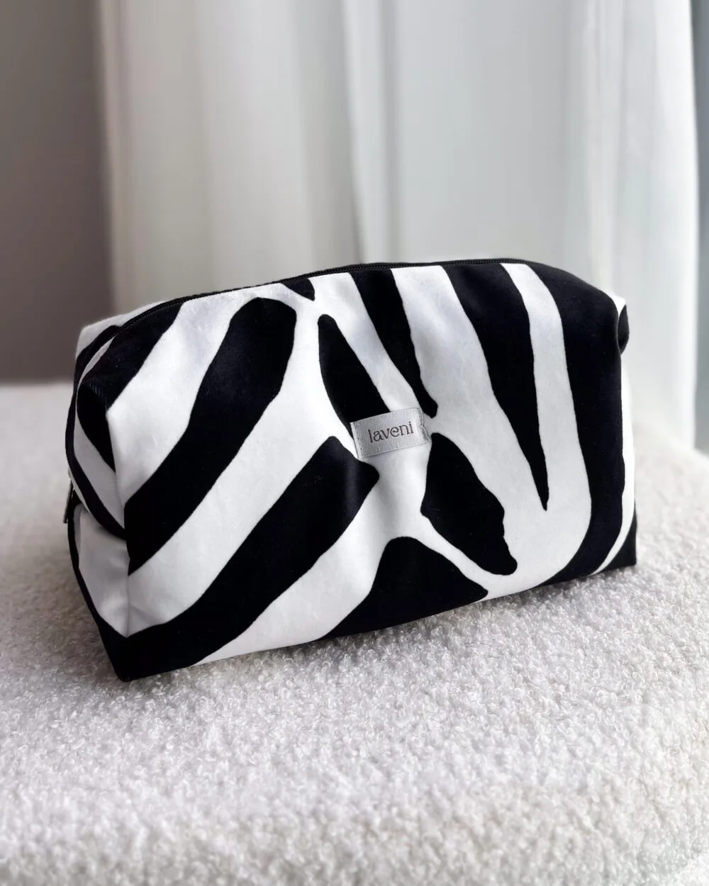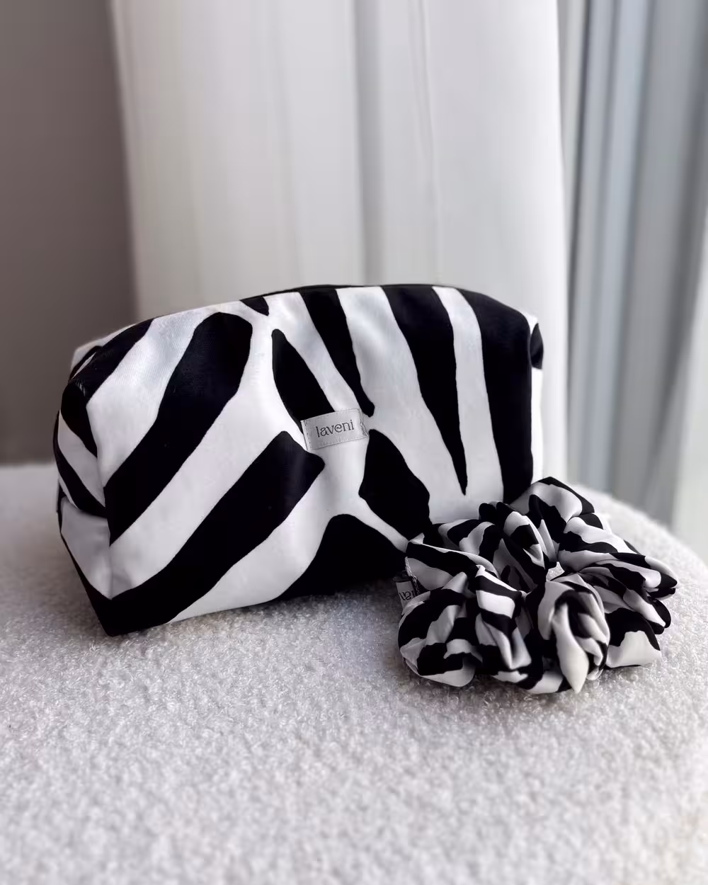Stylowy i niezwykle modny zestaw kosmetyczka i scrunchie zebra. Ten ręcznie szyty komplet w czarno-białe pasy (animal print) to must-have dla miłośniczek wyrazistych dodatków. Pojemna, welurowa kosmetyczka uporządkuje Twoje drobiazgi, a dopasowana scrunchie stanie się efektowną ozdobą włosów lub nadgarstka.
